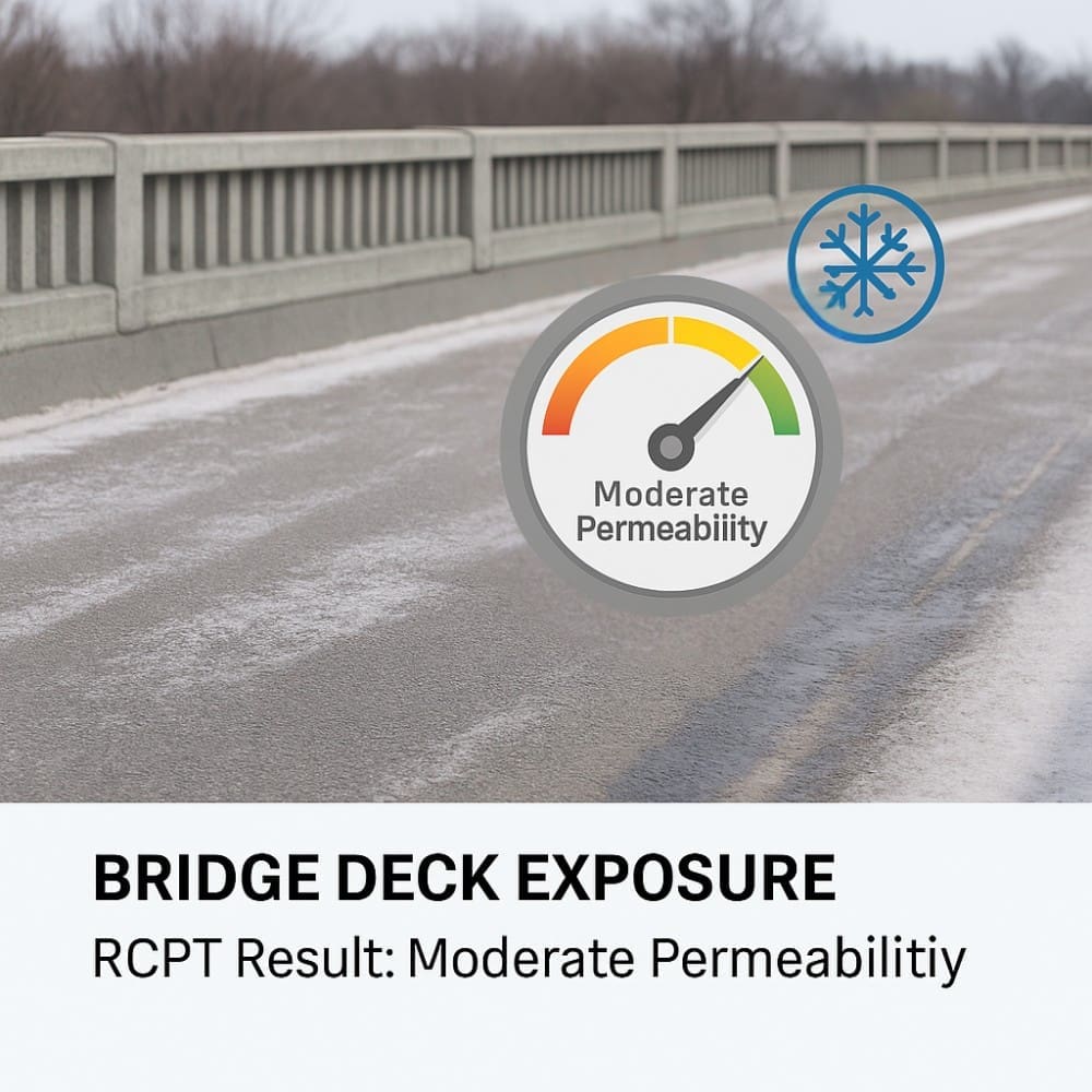 Chloride ions reaching steel cause corrosion — RCPT gives a rapid, quantitative indication of that risk.